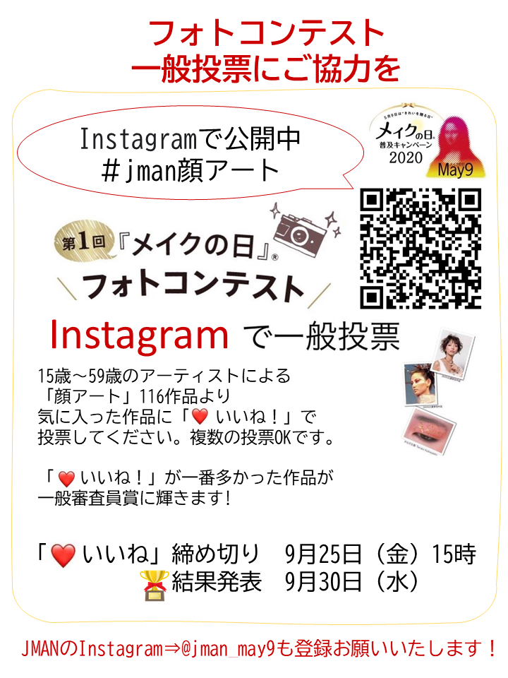 第1回メイクの日フォトコンテスト 一般投票受付中❣ 2020 9/11 未分類 2020.09.11 2020.09.11 第1回メイクの日フォトコンテストの応募作品を公開しています。全116作品。学生から第一線で活躍するプロのメイクアップアーティストまで。様々な「顔アート」が揃いました!作品をご覧いただき、気に入ったら是非「♡いいね!」を一番たくさん「♡いいね!」をもらった作品が一般審査員賞にかがきます。@jman_may9をフォローして、あなたも審査にご参加ください。 未分類 再開します❣ 第1回JMANメイクの日フォトコンテスト「顔アート」審査発表 この記事を書いた人 JMAN-運営事務局 関連記事 ◆第168回メイクアップ技術検定【3級】合格者 2019.09.09 ◆第178回 メイクアップ技術検定【3級】 合格者 2020.10.02 第1回JMANメイクの日フォトコンテスト「顔アート」審査発表 2020.10.01 第107回メイクアップ技術検定【3級】合格者 2015.07.24 What’s new? Vol.15(東京会場 4/12 日& 大阪会場4/25土)の受付を開始しました! 2020.01.27 JMAN講座 What’s New? vil.15 2020Spring&Summer 動画配信スタートに関するお知らせ 2020.04.25 ◆第185回JMANメイクアップ技術検定【3級】合格者 2020.10.29 2020 今年も『メイクの日』キャンペーン開始致しました! 2020.01.14